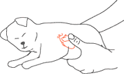 3. Check for a heartbeat; feel the chest wall between your fingers or use a stethoscope. If no heartbeat is found, compress the chest in the area right at the back of the bent elbow. This is the approximate location of the heart. Press the chest between the thumb and forefinger. Compress quickly. Remember a newborn puppy's normal heart rate is 120-180+ beats per minute.