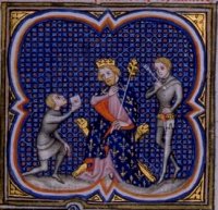 The Frankish barbarian Clovis (466-511 C.E.), son of the drighten Childeric, started out as hot-headed and violent in his nature.  Vengeful to a fault, it is rumored that he slayed a fellow soldier for breaking the famed Vase of Soissons a year after the incident occurred (Clovis very much wanted the vase for himself to present to the Bishop of Reims).  His leadership prowess was outstanding, however; using his abilities as a warlord and leader, he established a kingdom stretching from the west bank of the Rhine river to the Atlantic Ocean, uniting the Salian and Ripuarian Franks into a single dominion.  He married a Christian girl, Clothilde, who eventually persuaded him to convert to Christianity in 496 C.E.  After his conversion, the bishops in his realm helped him to unite all Christian people under one banner.  He completely conquered the Alamanni in 506 C.E., and defeated Alaric II, the last king of the Visigoths, in Poitiers in 507 C.E.  Clovis is known as the father of the Frankish empire; and therefore, also of France.   He was the first ruler of the Merovingian Dynasty.  After his death, the Frankish kingdom was divided among his four sons.