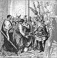 The Burgundian king Gundahar actually existed, although his legendary account is more famous, thanks to Wagner.  He reigned in the court of Worms in what is now southwestern Germany, along the Rhine.  In the legends of the Volsung saga and the Nibelungenleid, he is the brother of Gudrun, wife of Sigurd (Sigifried) the Dragon-slayer; and husband of Brunhildde.  Because of the treachery in which he and his half-brother Hagan slayed Sigurd, he was doomed to defeat at the hands of Attila in 436.  Whether or not the legend is fully true, King Gundahar did die at the hands of Attila and his forces, along with 20,000 of his Burgundian warriors.  His descendents became part of the French nation; Bourgogne is one of the main divisions of France to this day.