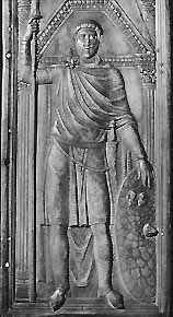The Herulian Odoacer is credited with being the barbarian who brought about the end of the Roman Empire.  In 476 C.E., he forced the last of the Western emperors to abdicate.  Odoacer was a rash and arrogant fellow, though, with little concern for others.  It was no one's grief when he was slain by Theoderic in 489 C.E., although the manner of his death was fairly grisly; Theoderic clove him from the shoulder down to the groin with his sword.