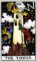 Vortigern was a warlord in Britain during the 5th century C.E.  By all accounts, Vortigern appeared to be a usurper and a pretender to the rule of Britain, and was shown to be a man of low character and inclinations.  He achieved his position through assassination and treachery, killing even the young king, Constans, to whom he was an advisor.  Constans' baby brother, Uther, was unknown to Vortigern and so escaped his treachery.  Vortigern ruled Britain with the aid of Saxon mercenaries who kept him in power until he, too, dealt with them harshly.  The Saxons eventually turned on him and Vortigern met his death in a blazing castle tower in Wales at the hands of Geoffrey of Monmouth, although some sources claim that the tower was mysteriously struck by lightning, catching it on fire.  (Later, when the Tarot decks of the middle ages and renaissance were designed, this imagery became the inspiration behind the card "The Tower".  Vortigern is the figure in the foreground plummeting headfirst from the lightning-blasted tower.) After Geoffrey's rule of Britain, Constans' brother, Uther Pendragon, became ruler of Britain, and Uther Pendragon was the father of the legendary King Arthur.  (Representation of "The Tower" from the Rider-Waite Tarot Deck).