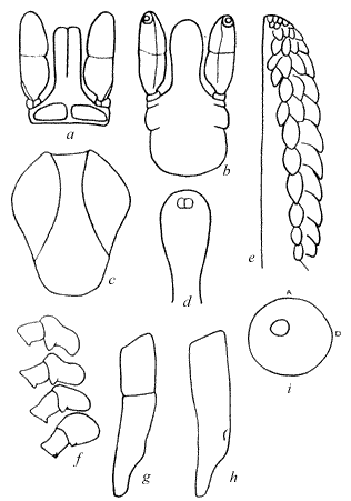 Fig. I-I. eudyptidis, female: a, capitulum (dorsal view); b, capitulum (ventral view); c, scutum; d anal grooves; e, hypostome; f, coxae and trochanters; g, tarsus IV; h, tarsus 1; i, spiracular plate.